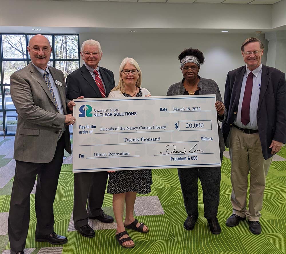 AIKEN, S.C. (September 12, 2024) — Savannah River Mission Completion (SRMC), the Savannah River Site liquid waste contractor, donated $15,000 to the Nancy Carson Library in North Augusta, S.C. The Nancy Carson Library, built in 1989, successfully completed its $1.8