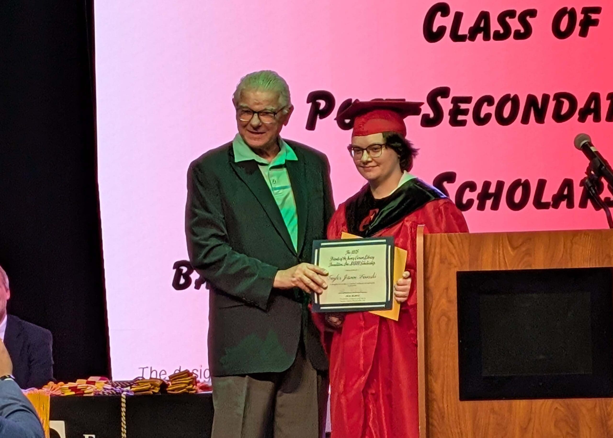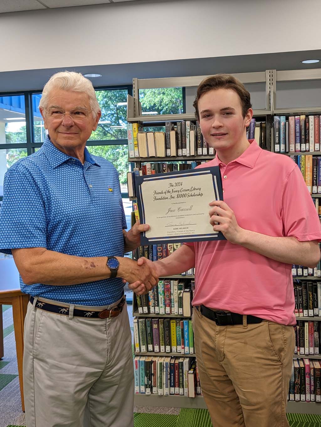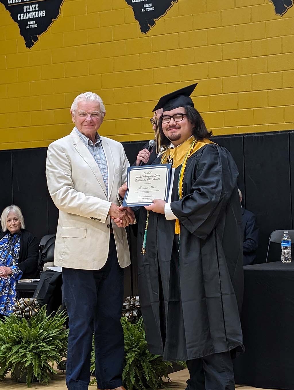 NCL Friends Board President Gene Helmich presents Alexavier Moore with a $1000 scholarship during North Augusta High School’s Honors Night (5/23/24). Alexavier Moore