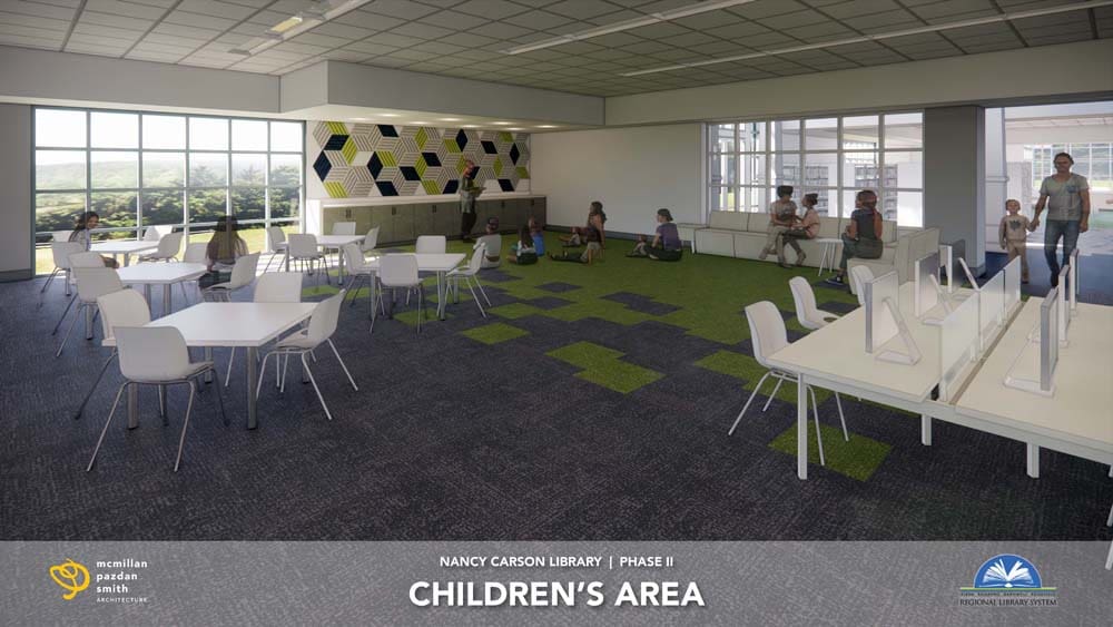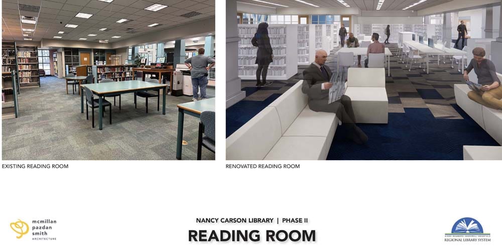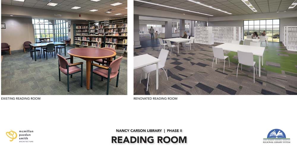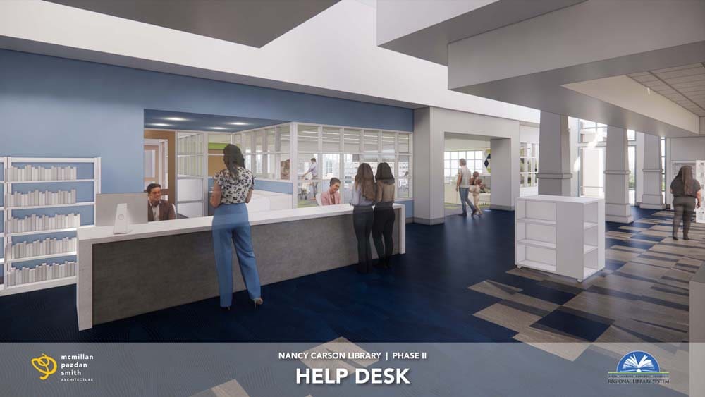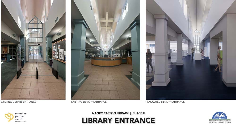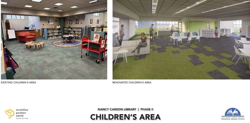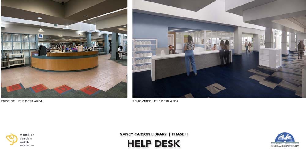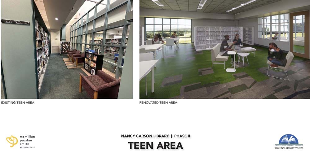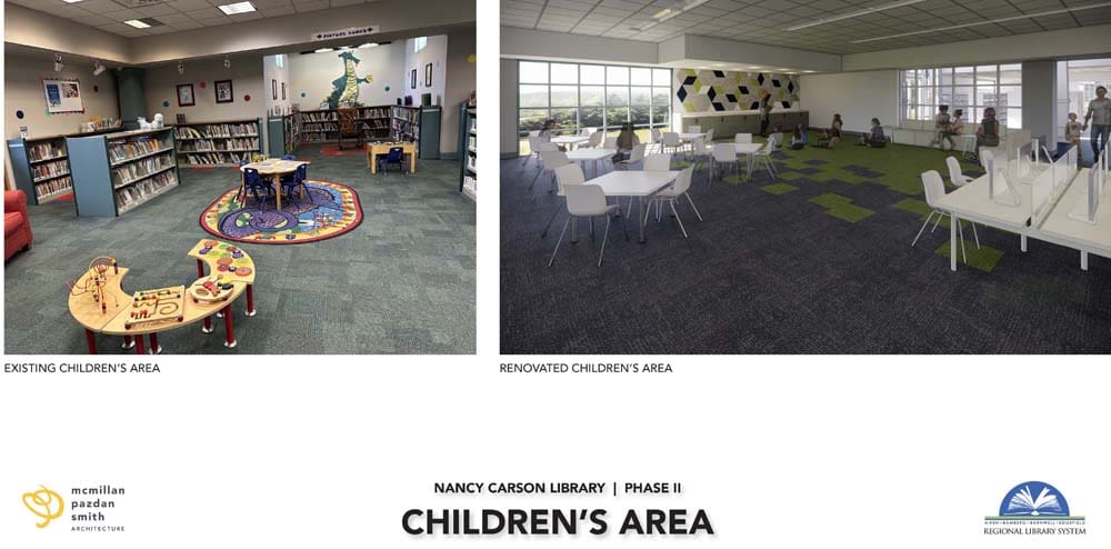 For the Nancy Carson Library, the changes will include a more prominent location for the children’s area, a dedicated teen space, small group study rooms, updated technology, attractive furnishings, streamlined service desks, and an ADA-compliant family restroom.