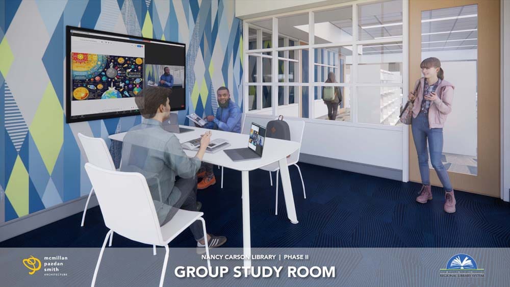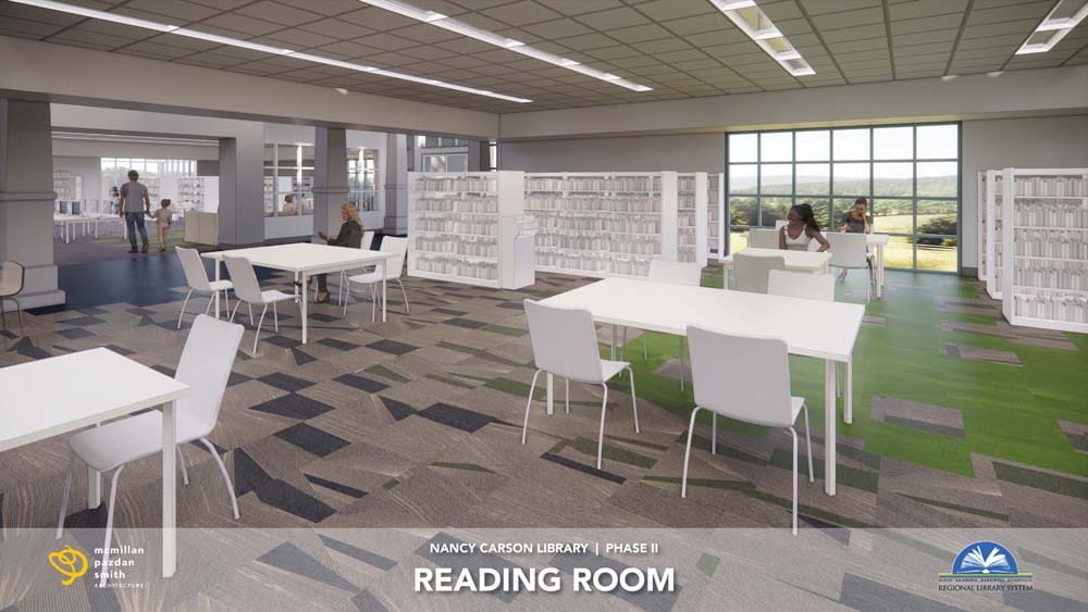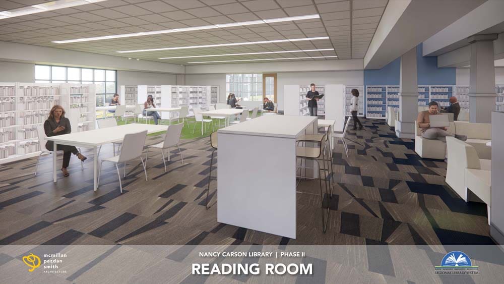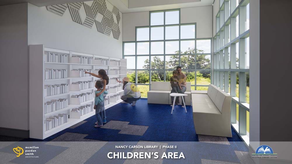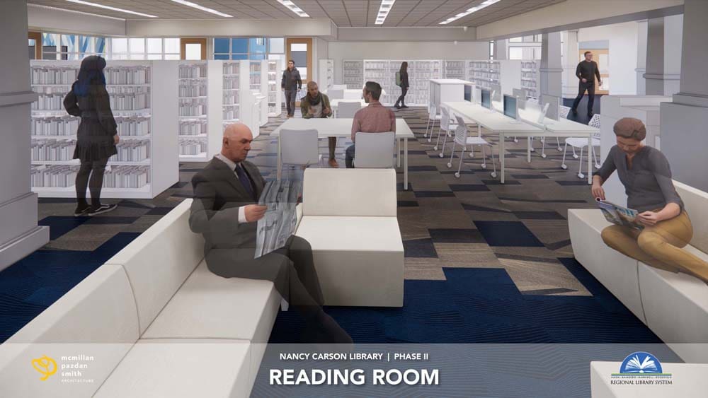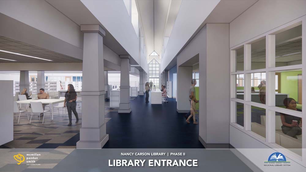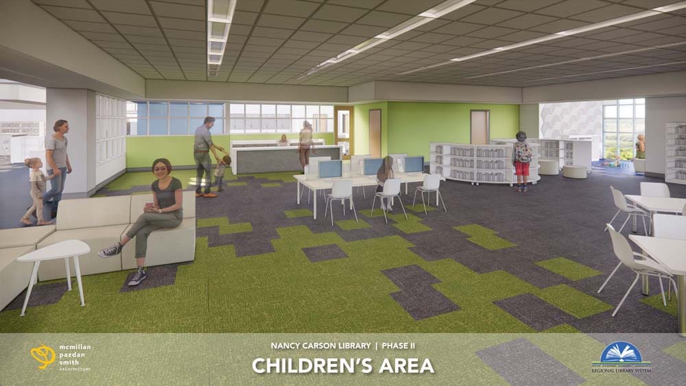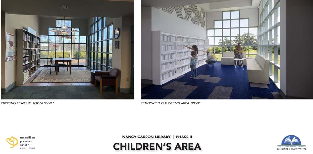 For the Nancy Carson Library, the changes will include a more prominent location for the children’s area, a dedicated teen space, small group study rooms, updated technology, attractive furnishings, streamlined service desks, and an ADA-compliant family restroom.